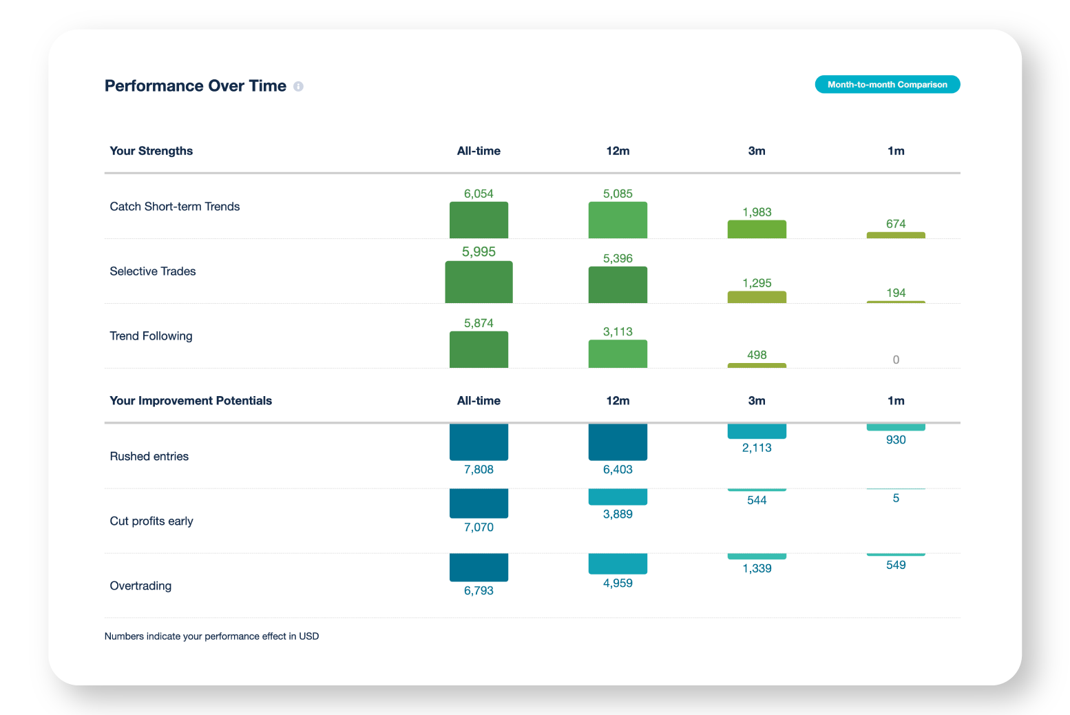 Track how your trading behavior and performance evolve to stay ahead the curve and trade smarter over time.